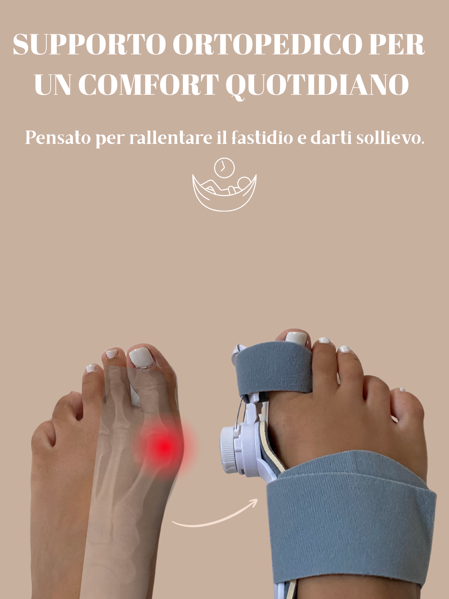 No. È realizzato in silicone morbido ed elastico, progettato per adattarsi al piede senza causare dolore. Può esserci una leggera sensazione di pressione all’inizio, ma è normale: significa che il tutore sta lavorando per riallineare l’alluce.